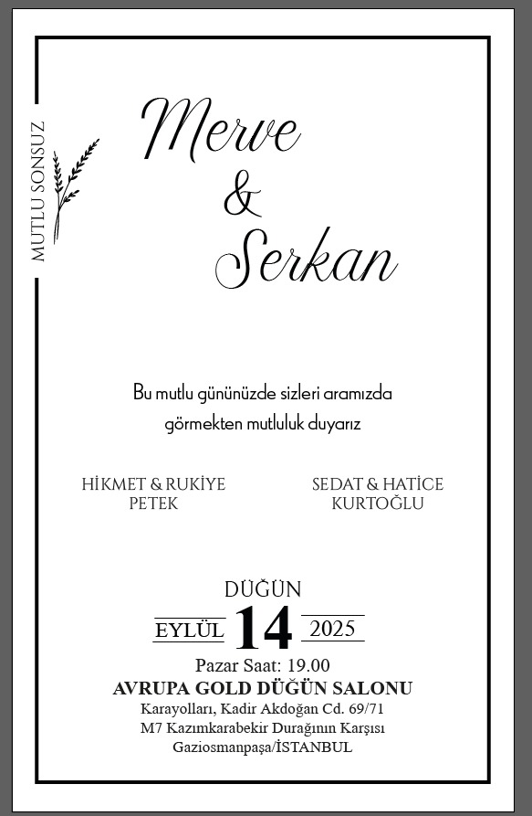 Köyümüzden Rukiye, Hikmet Petek’in kızı Merve hanım ile Serkan Beyin 14 Eylül 2025 Pazar günü Saat: 19:00 itibariyle AVRUPA GOLD DÜĞÜN SALONU Karayolları, Kadir Akdoğan Cd. 69/71 M7 Kazımkarabekir Durağının Karşısı Gaziosmanpaşa / İSTANBUL adresinde düğün törenleri gerçekleştirilecektir.